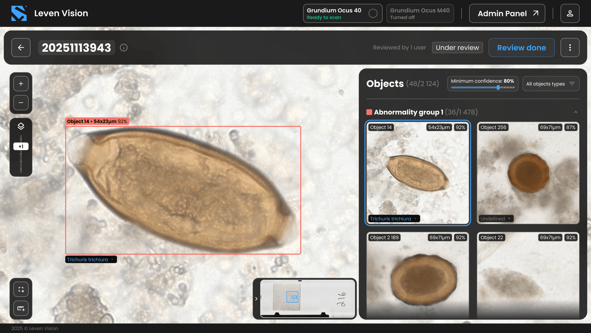 Once the data is uploaded, the AI instantly identifies parasite species. You receive visual evidence for every finding, with dimensions to confirm the identification. Simply review the AI’s results and provide the final diagnostic confirmation.